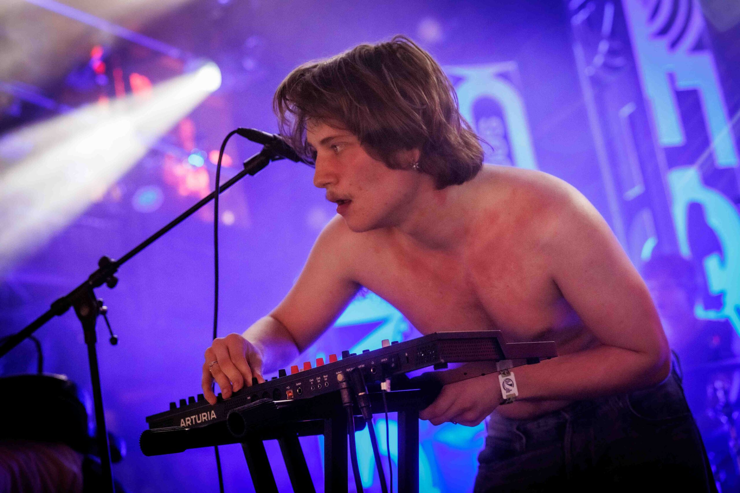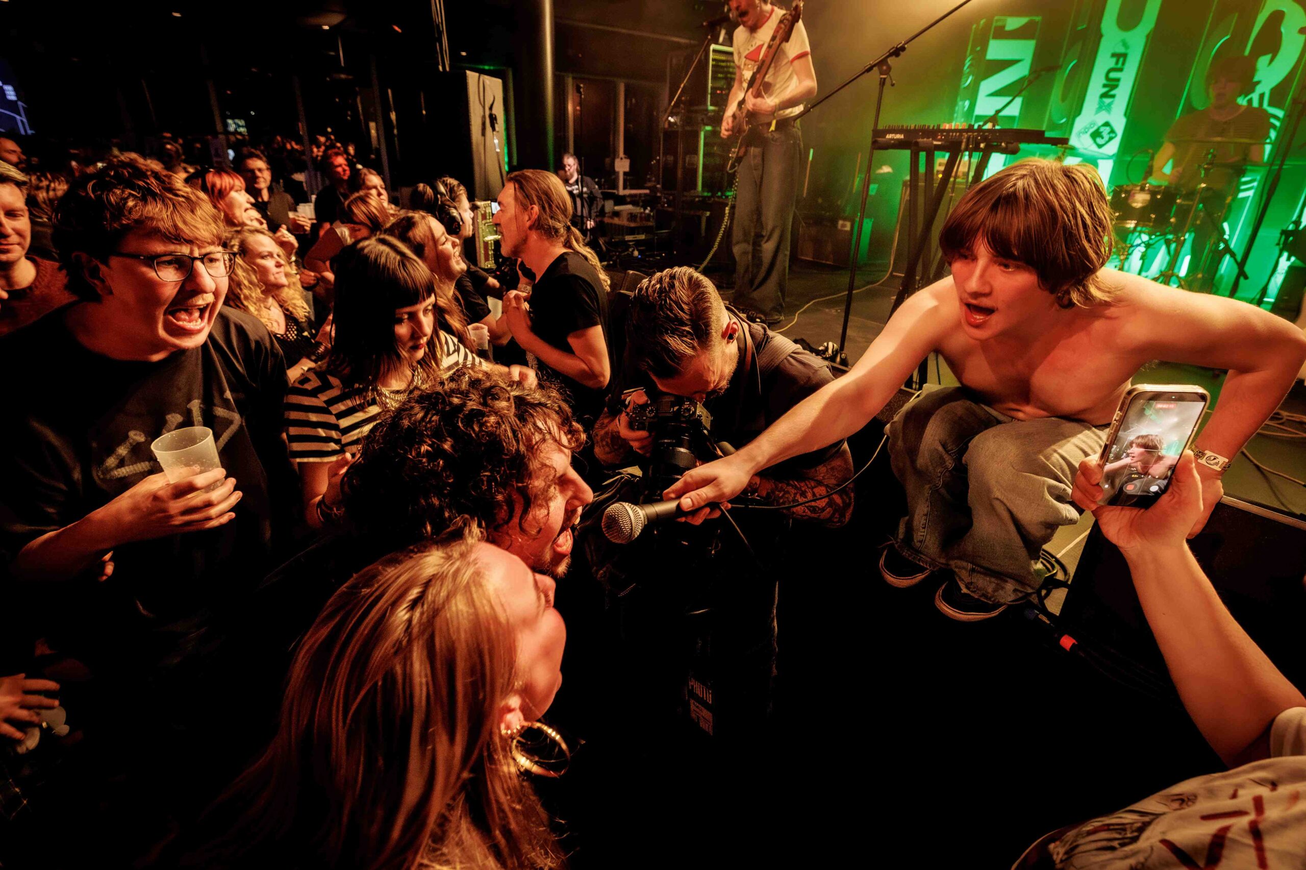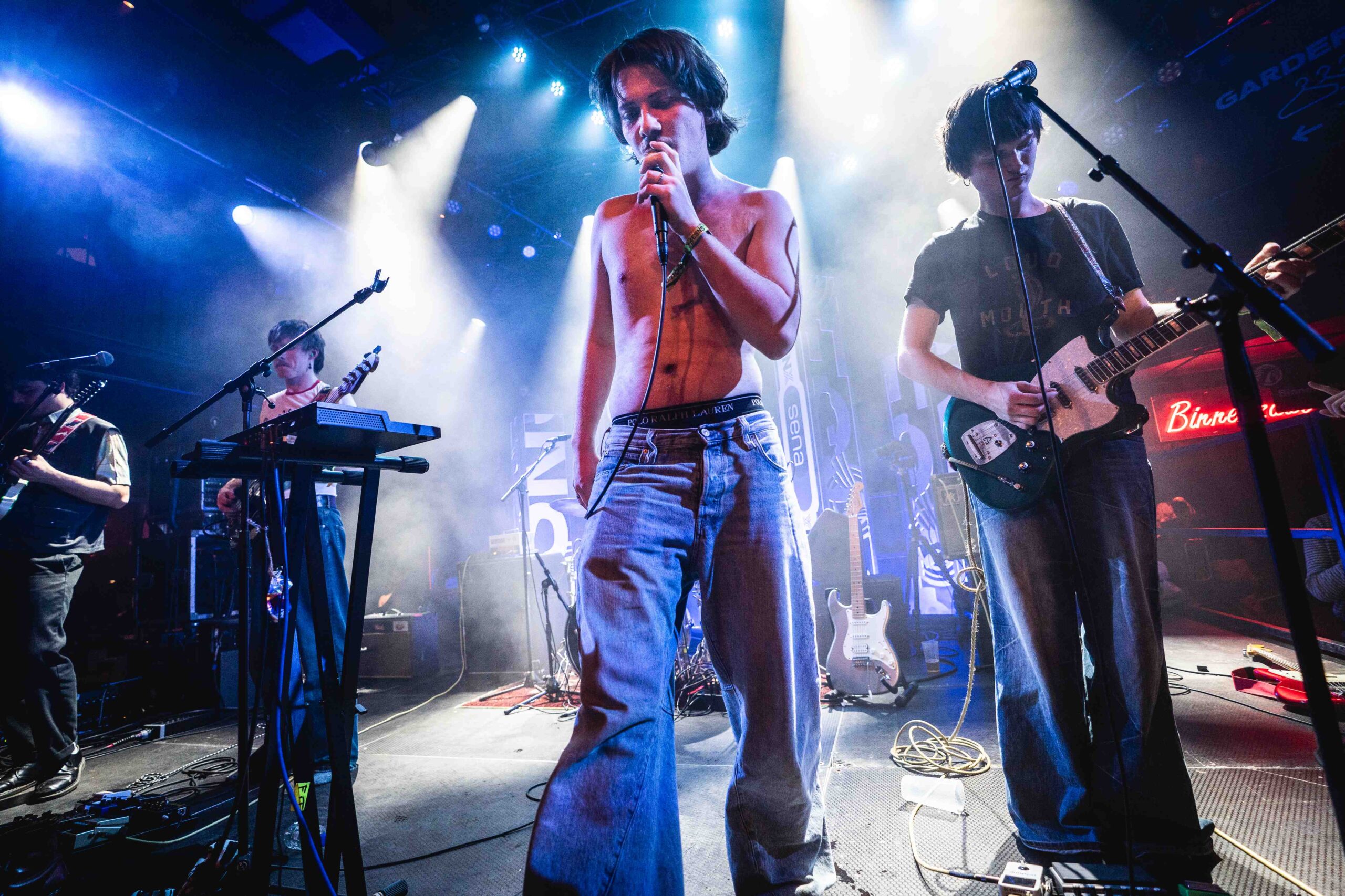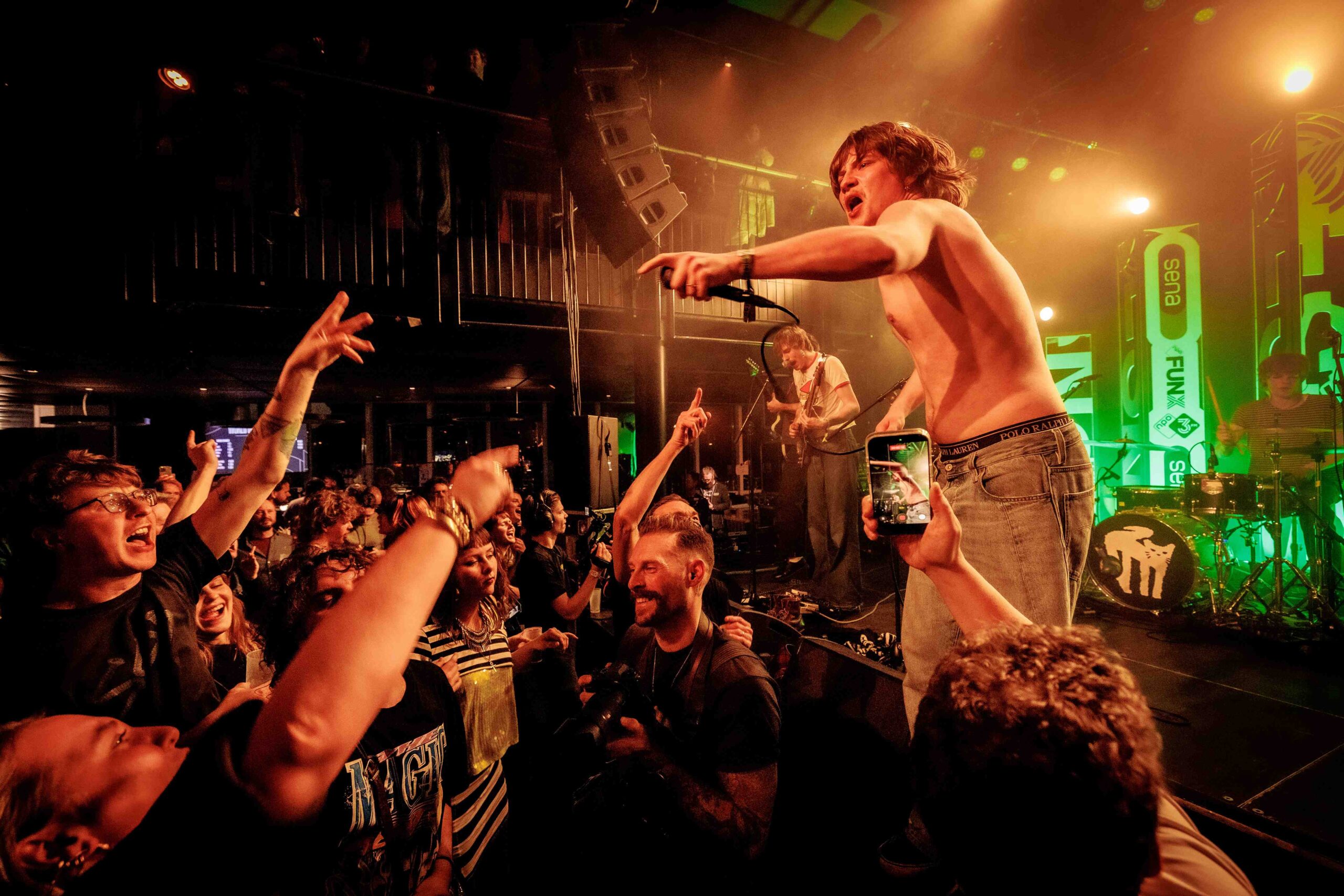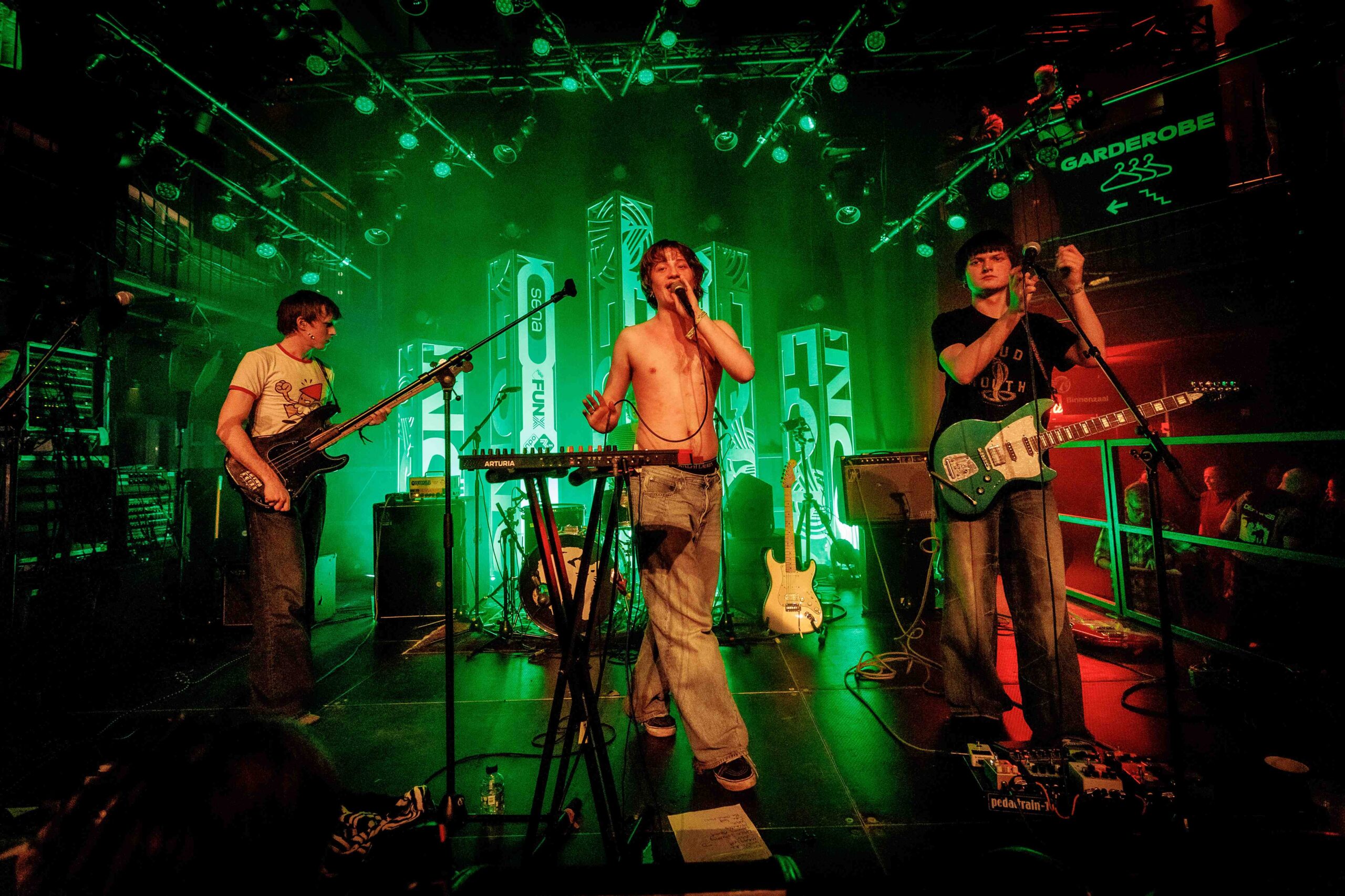 Een heel ander geluid horen we in de Entreehal bij de energieke en euforische post-punkrock van het Utrechtse Fit. Het is hier beuken en springen geblazen, mede door de uitzinnige performance van frontman Ide Ploeg die na twee nummers als zijn shirt uittrekt. De monotone stem van Ploeg, die overigens nauwelijks verstaanbaar is, spreekt weinig tot de verbeelding, maar zijn onvermoeibaarheid en wilde sprongen op het podium werkt aanstekelijk bij het publiek en zijn bandleden. Hij gaat dan ook tot het gaatje. Muzikaal is het vooral de ritmesectie die strak en stuwend spel brengt, aangevuld door rauw en spetterend gitaarspel, vol fills en ritmewisselingen.