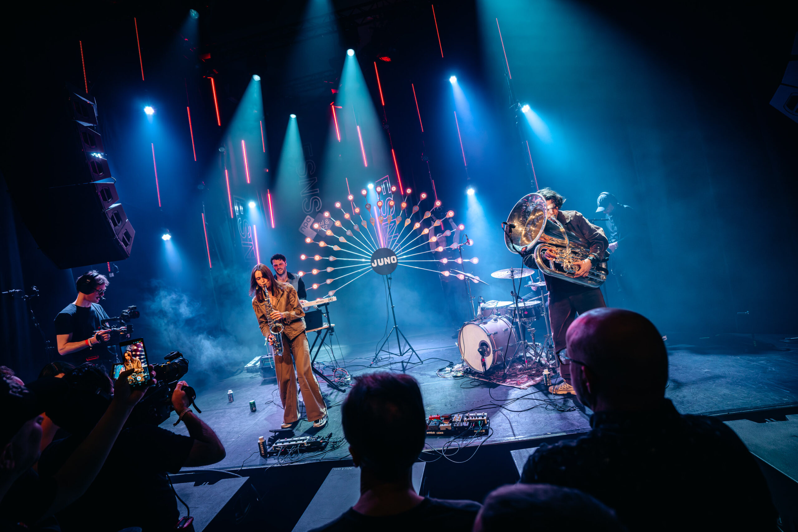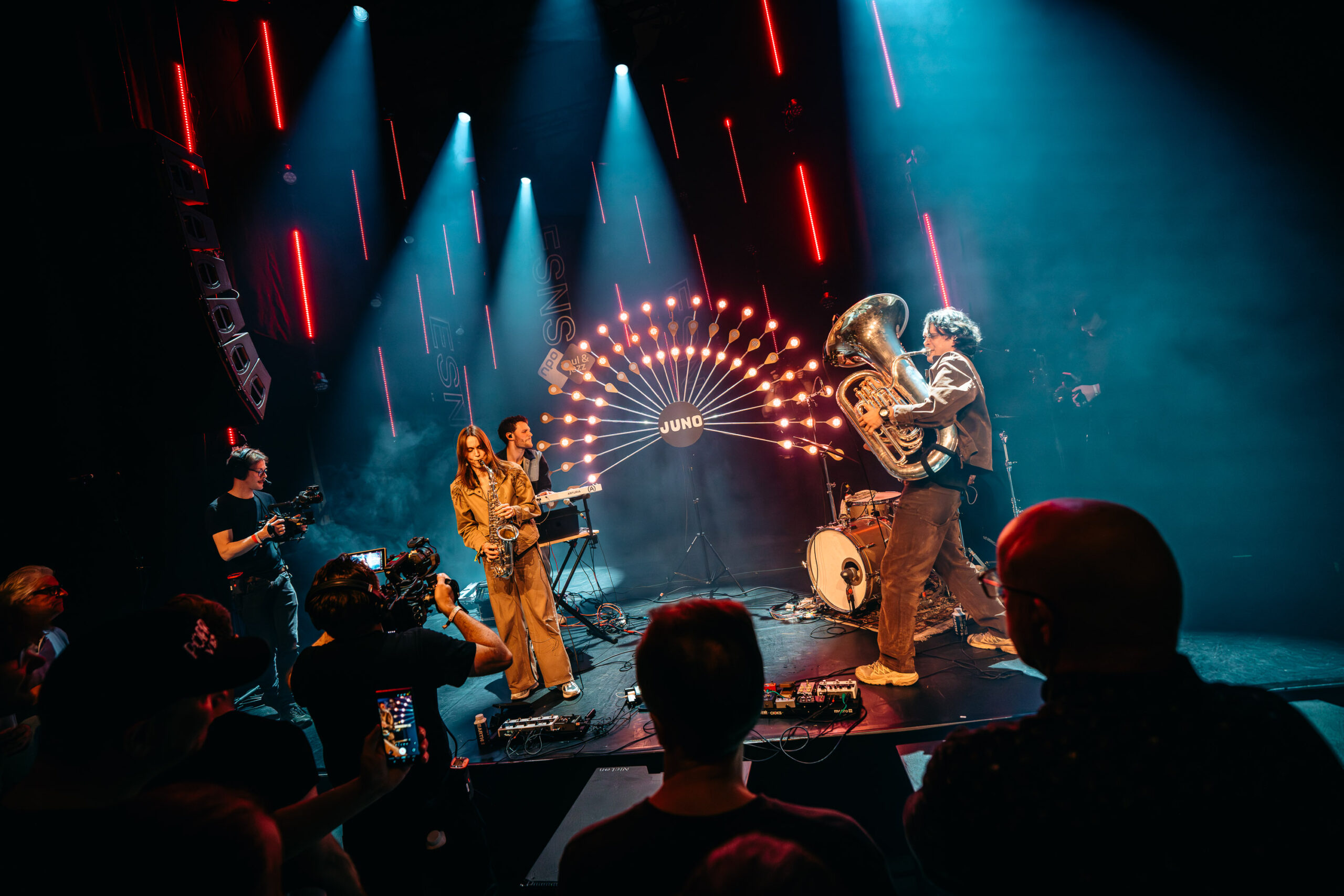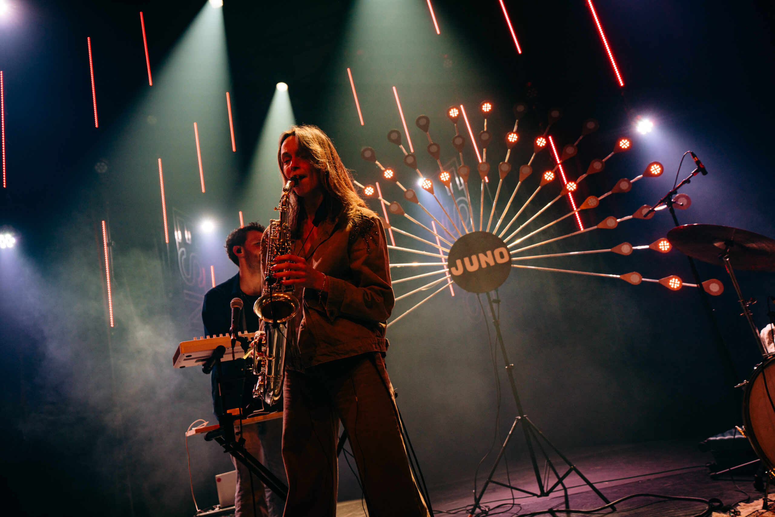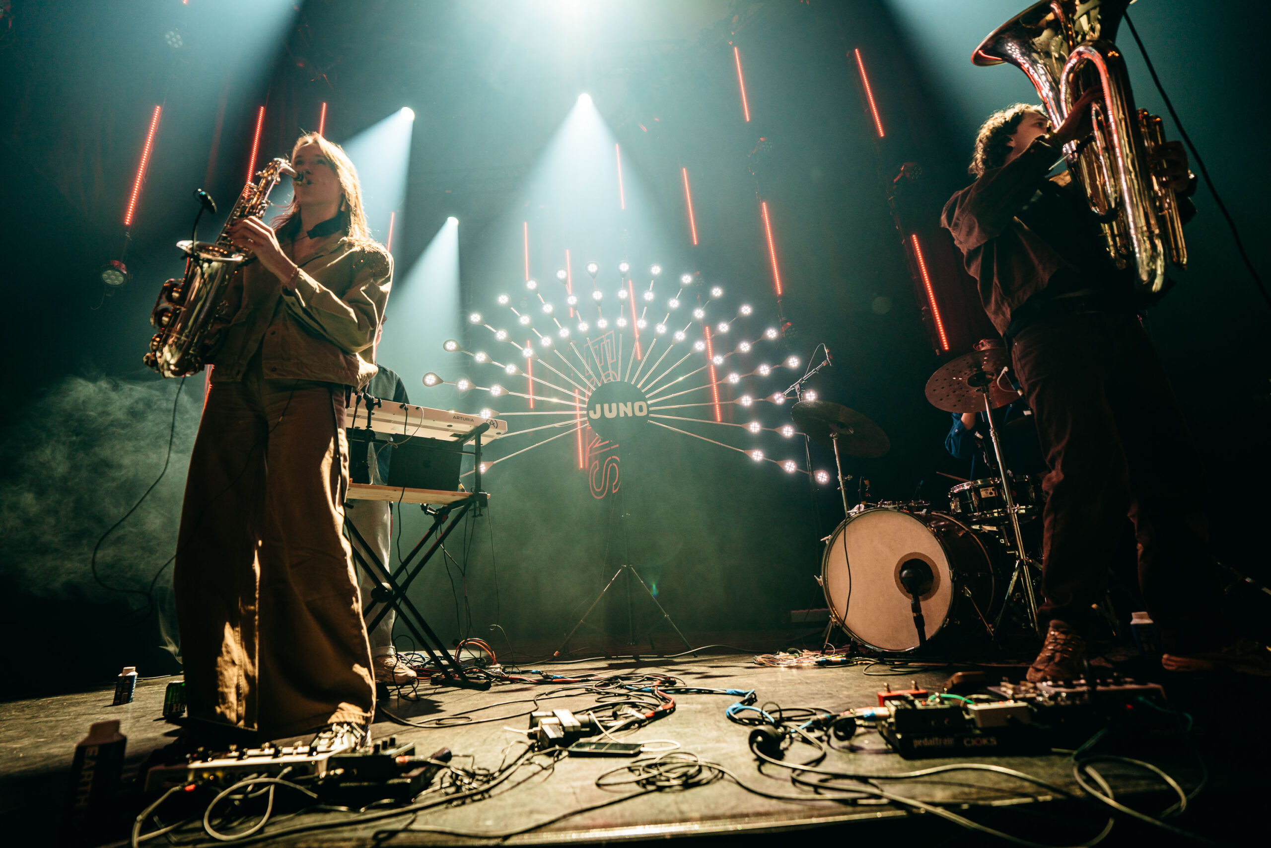 Na al die intensiteit en heftige gitaren, sluiten we Noorderslag af met aanstekelijke en speelse jazzdance grooves van Juno. Het collectief heeft een aparte bezetting: synths, drums, tuba en altsax. Het viertal brengt een lekkere combi van heavy brass en fijne melodiethema’s gespeeld door saxofoniste Jeline Weeling.