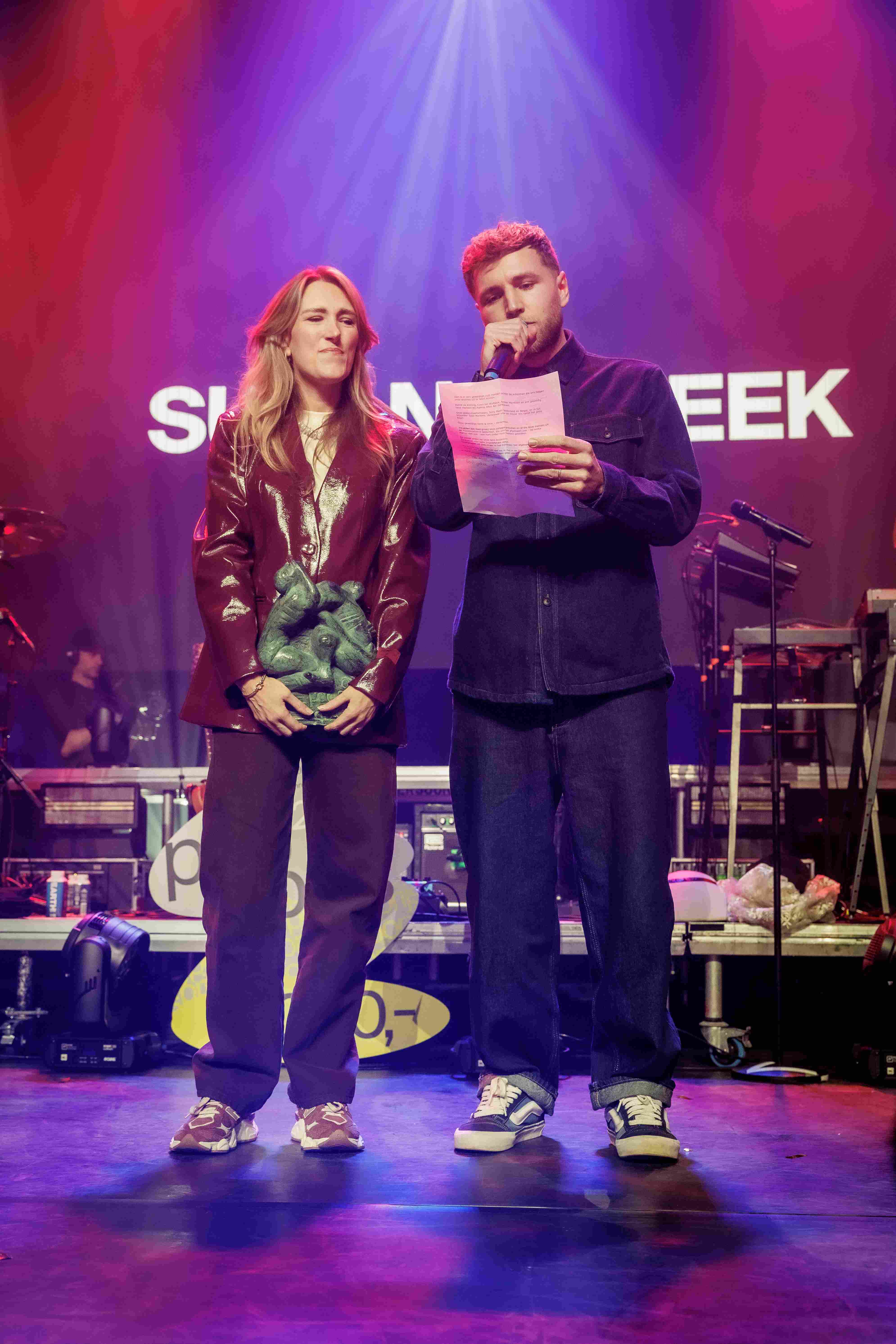 Suzan en Freek namen de prijs persoonlijk in ontvangst, maar traden niet op. Freek voerde sterk het woord, Suzan stond er geëmotioneerd zwijgend naast. Het was hun eerste uitje als kersverse ouders, maar optreden deden ze begrijpelijk nog niet. In plaats daarvan neemt de zeer schaars geklede Merol de honneurs waar. En daar werden we niet zo enthousiast van, dus door naar de Kleine Zaal.