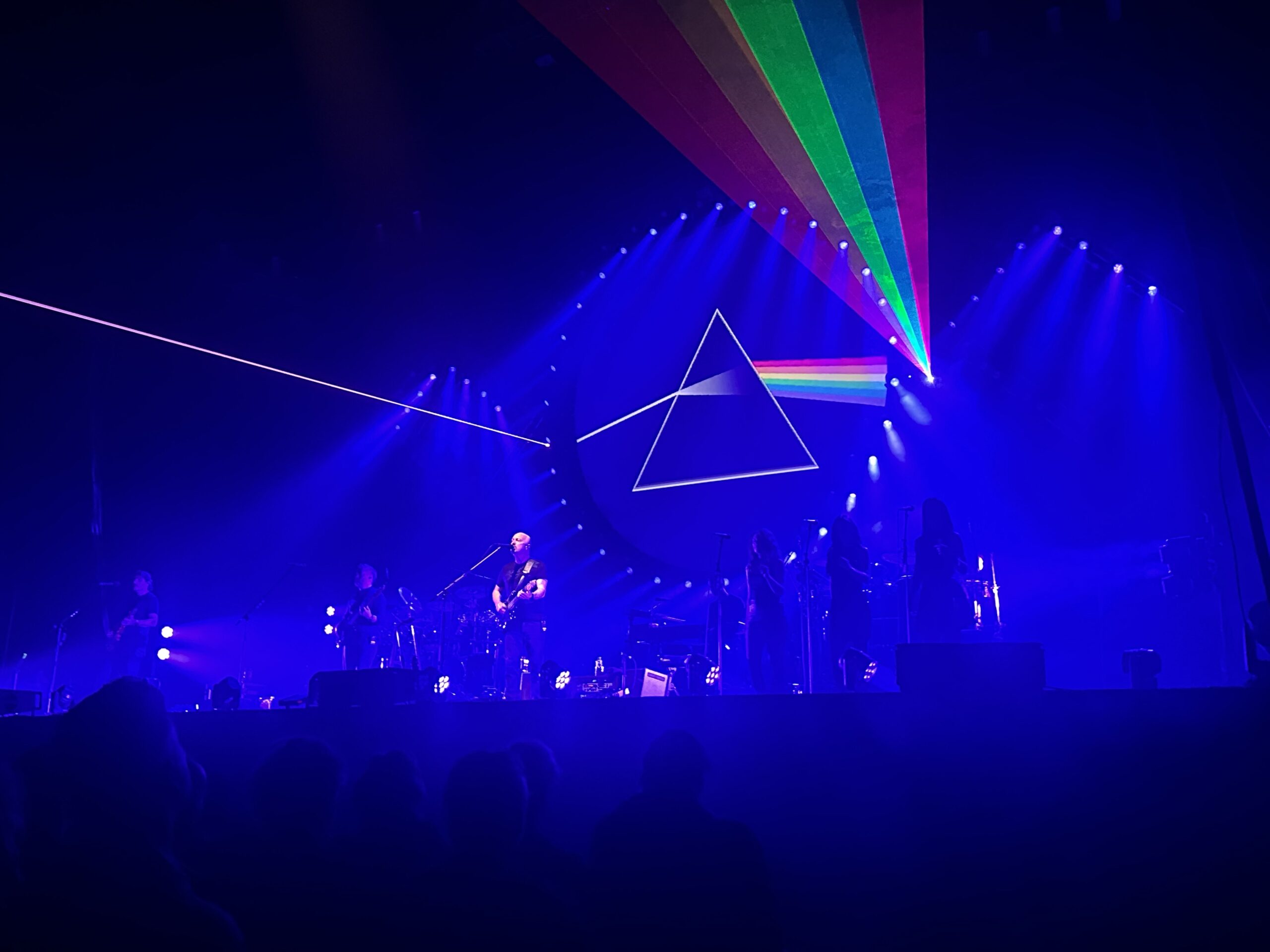 Bij Wish You Were Here verandert de zaal in een sterrenhemel van telefoonlichtjes. Op het ronde scherm verschijnt archiefmateriaal van David Gilmour en Roger Waters die elkaar omhelzen. Pijnlijk en mooi tegelijk, met de huidige realiteit in het achterhoofd.