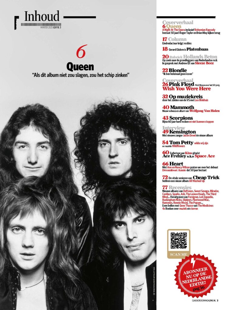 De wintereditie van Classic Rock Magazine viert 50 jaar Queens meesterwerk A Night At The Opera met een exclusief coververhaal over de magie achter Bohemian Rhapsody. Pink Floyds Nick Mason blikt terug op Wish You Were Here, terwijl Debbie Harry (Blondie) vertelt over haar eeuwige allure. Verder: Wolfgang Van Halen over zijn nieuwe album The End, een eerbetoon aan Kiss-legende Ace Frehley, en Tom Petty’s intieme Wildflowers-verhaal. Ontdek Nederlandse trots met Kensingtons comeback en Leo Blokhuis’ muziekreis door het diepe zuiden van de VS. Plus: Scorpions, Heart, Cheap Trick, en tientallen albumrecensies van Deftones tot Suede.